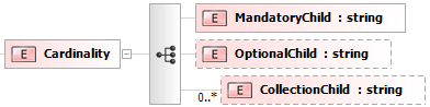 Generated Code As you can see there are 3 main properties within the class (MandatoryChild, OptionalChild & CollectionChild). Xml Created <?xml version="1.0"?> <!--Created by Liquid XML Data Binding Libraries (www.liquid-technologies.com) for Liquid Technologies Ltd--> <Cardinality xmlns:xs="http://www.w3.org/2001/XMLSchema-instance"> <MandatoryChild>Some value</MandatoryChild> <CollectionChild>First item in collection</CollectionChild> <CollectionChild>Second item in collection</CollectionChild> </Cardinality> Notes We use the IsValidOptionalChild property to determine if the OptionalChild element was present in the XML. Extension A base complex type can be extended, the concept is similar to that of inheritance in C# C++ Java etc. In this sample we define a base complex type 'BaseComplexType', and derive from it 2 other complex types 'DerivedComplexType1' & 'DerivedComplexType2'. Sample XSD <xs:schema xmlns:xs="http://www.w3.org/2001/XMLSchema" elementFormDefault="qualified" attributeFormDefault="unqualified"> <xs:complexType name="BaseComplexType"> <xs:sequence> <xs:element name="ChildOfBaseType" type="xs:string"/> </xs:sequence> </xs:complexType> <xs:complexType name="DerivedComplexType1"> <xs:complexContent> <xs:extension base="BaseComplexType"> <xs:sequence> <xs:element name="ChildOfDerivedType1" type="xs:string"/> </xs:sequence> </xs:extension> </xs:complexContent> </xs:complexType> <xs:complexType name="DerivedComplexType2"> <xs:complexContent> <xs:extension base="BaseComplexType"> <xs:sequence> <xs:element name="ChildOfDerivedType2" type="xs:string"/> </xs:sequence> </xs:extension> </xs:complexContent> </xs:complexType> <xs:element name="UsingElement"> <xs:complexType> <xs:sequence> <xs:element name="BaseType" type="BaseComplexType"/> </xs:sequence> </xs:complexType> </xs:element> </xs:schema>