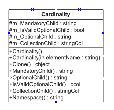 Generated Code This is a UML representation of the generated code, note that there are 3 string properties (FirstChild, SecondChild & ThirdChild) corresponding with the child elements within ParentSeq. There are also 3 other properties IsValidFirstChild, IsValidSecondChild &IsValid ThirdChild, these indicate whether the corresponding property contains a valid value. The property ChoiceSelectedElement, indicates which of the 3 elements is selected at any given time. If one element is selected (i.e. FirstChild contains a value), and then another is given a value (say SecondChild is set to "Some Text"), then FirstChild will become invalid (IsValidFirstChild will return false, and reading from FirstChild with raise an exception), and ChoiceSelectedElement will reference SecondChild.