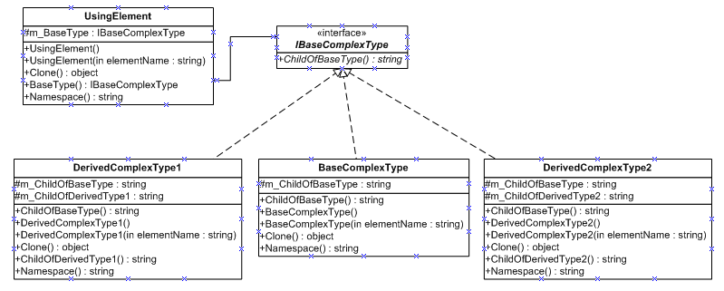 Generated Code As you can see a class is created for every element defined within the schema. In order to allow any element that extends BaseComplexType, to be used wherever BaseComplexType is referenced (i.e. in UsingElement) an interface has been created (IBaseComplexType). This is implemented by all classes capable of being used where BaseComplexType appears.
