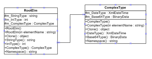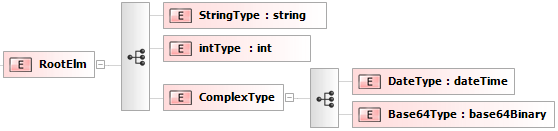 Notes If more than one child element is selected in the XML then the FromXmlFile will raise an exception. We.ve now covered how the basic constructs (all/sequence/choice) are represented. However all the child items used have all been of type string. Sample XSD <?xml version="1.0" encoding="UTF-8"?> <xs:schema xmlns:xs="http://www.w3.org/2001/XMLSchema" elementFormDefault="qualified" attributeFormDefault="unqualified"> <xs:element name="RootElm"> <xs:complexType> <xs:sequence> <xs:element name="StringType" type="xs:string"/> <xs:element name="intType" type="xs:int"/> <xs:element name="ComplexType"> <xs:complexType> <xs:sequence> <xs:element name="DateType" type="xs:dateTime"/> <xs:element name="Base64Type" type="xs:base64Binary"/> </xs:sequence> </xs:complexType> </xs:element> </xs:sequence> </xs:complexType> </xs:element> </xs:schema>