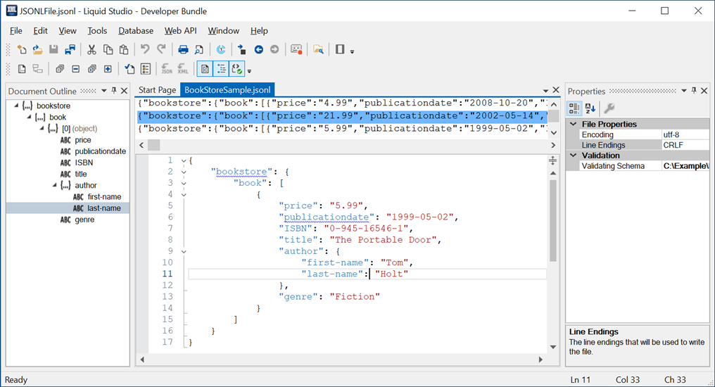 The JSON Lines Editor displays the entire JSON Lines file's data in the top view, as minified JSON, and an individual line's data in the bottom view as and expanded JSON document.